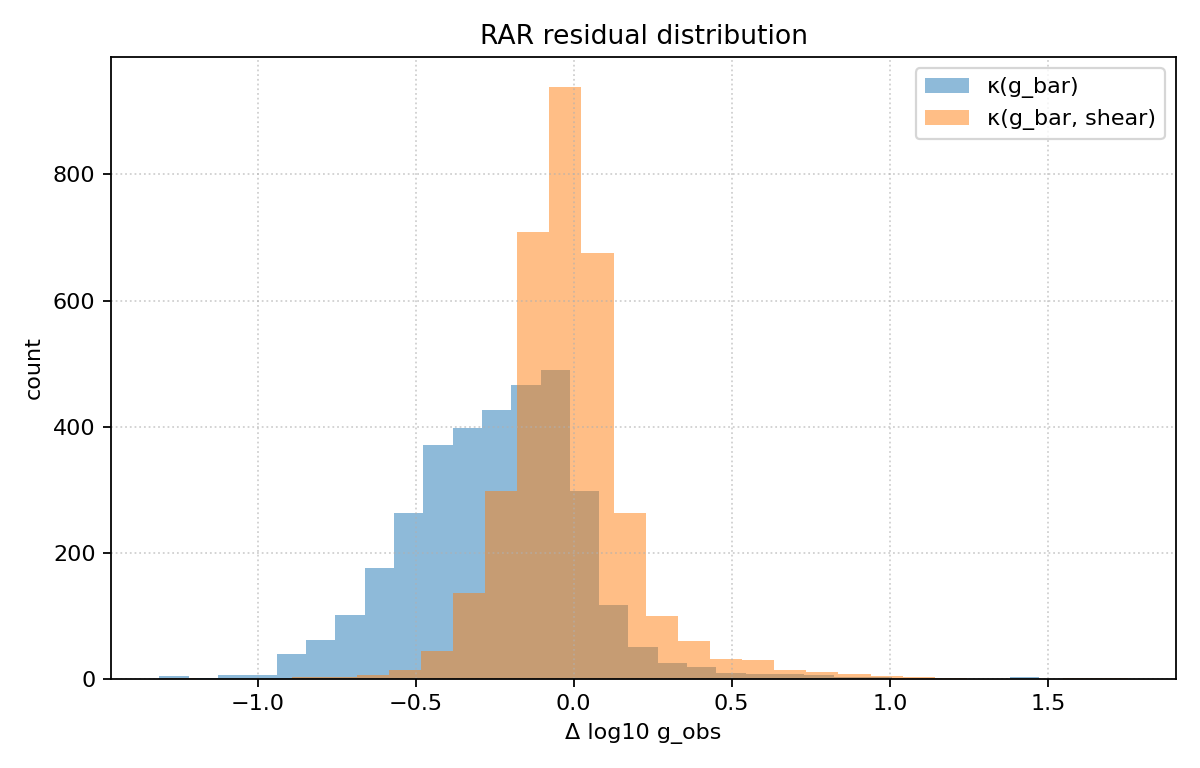 Figure 12: Residuals are concentrated near zero, indicating that the κ-based predictions reproduce the observed radial acceleration relation with relatively small scatter. The inclusion of baryonic shear slightly narrows the residual distribution.