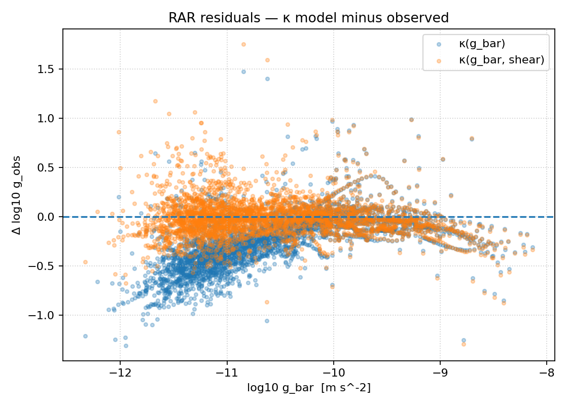 Figure 11: The vertical axis shows the difference between predicted and observed accelerations , plotted as a function of baryonic acceleration . Points represent measurements across the stacked SPARC galaxy sample. The dashed horizontal line indicates zero residual. Both the and models track the observed RAR with relatively small systematic deviations, with the shear-augmented model reducing residual structure in parts of the low-acceleration regime.