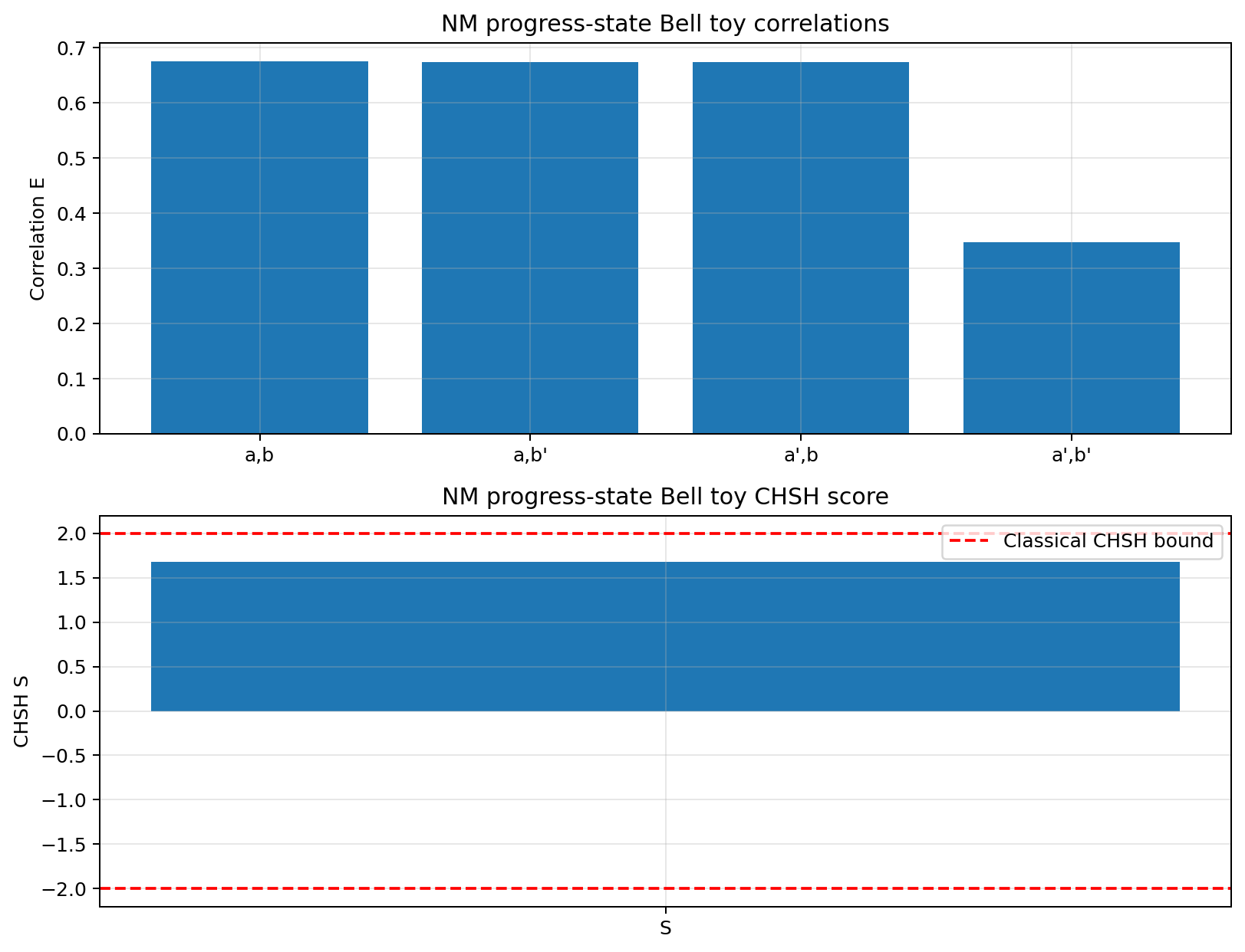 Figure 1: Representative progress-state Bell toy result for a fixed local response window. Top: the four Bell-setting correlations. Bottom: the corresponding CHSH score. Numerical values shown here and below are estimated by Monte Carlo sampling of under the stated uniform source distribution.
