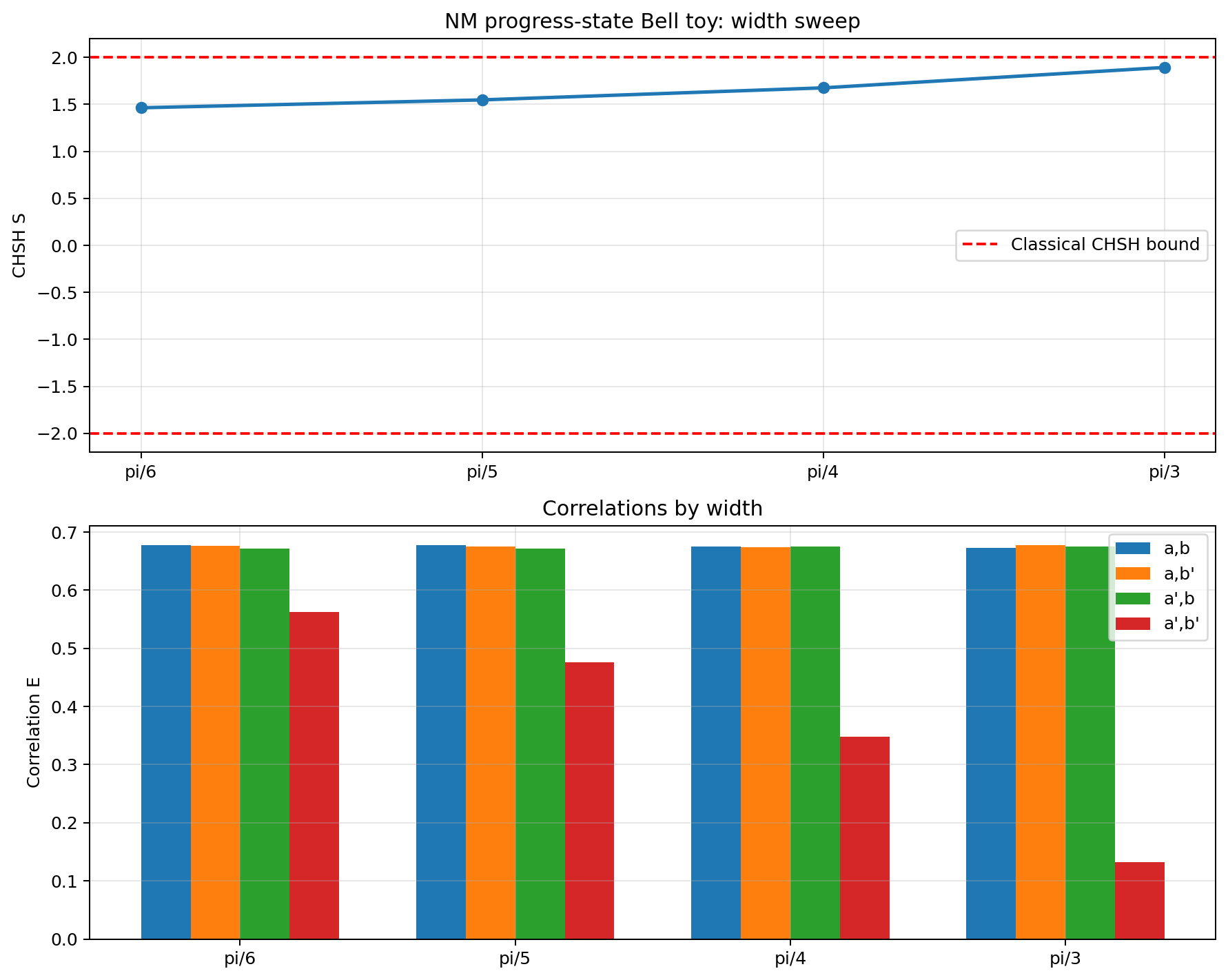 Figure 2: CHSH score as a function of response-window width for the progress-state Bell toy. Top: CHSH score across the width sweep. Bottom: the four setting-pair correlations across the same sweep. The score rises from at to at , approaching but not exceeding the classical bound.