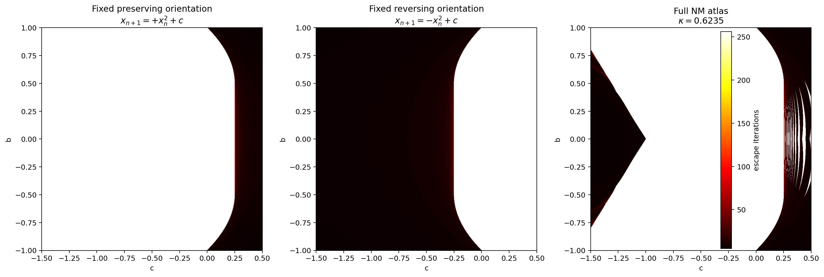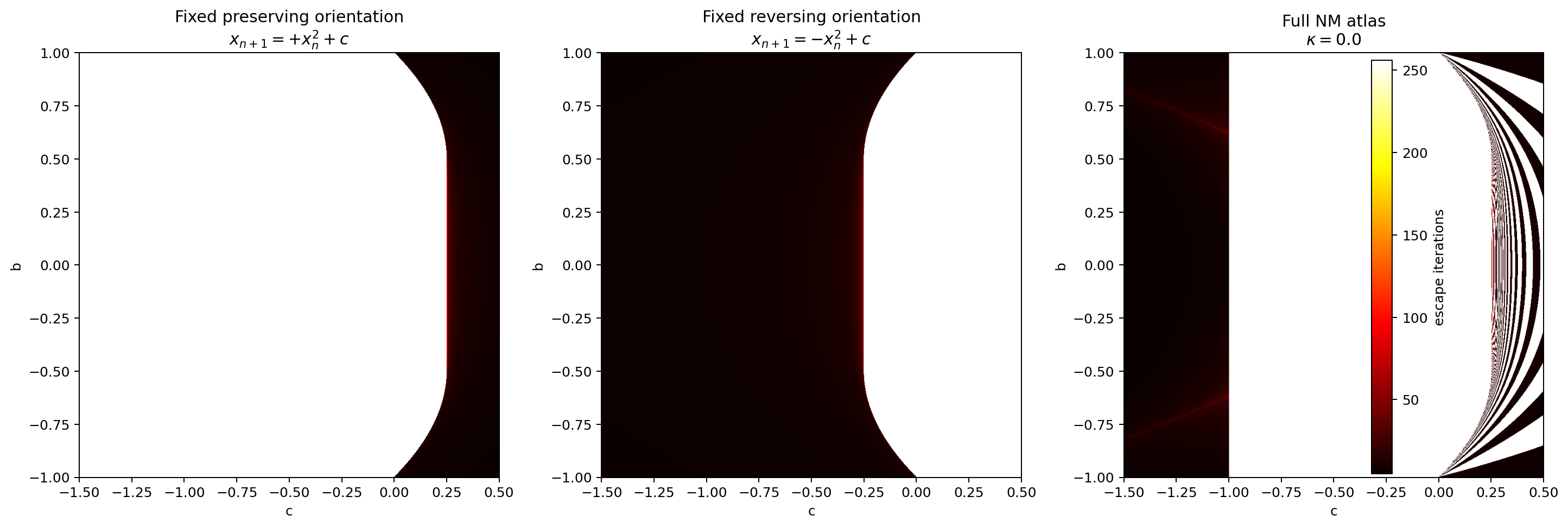with real parameter . The standard atlas colours each parameter value by whether the orbit escapes beyond a threshold. This view records coarse stability, but it suppresses internal orientation history.