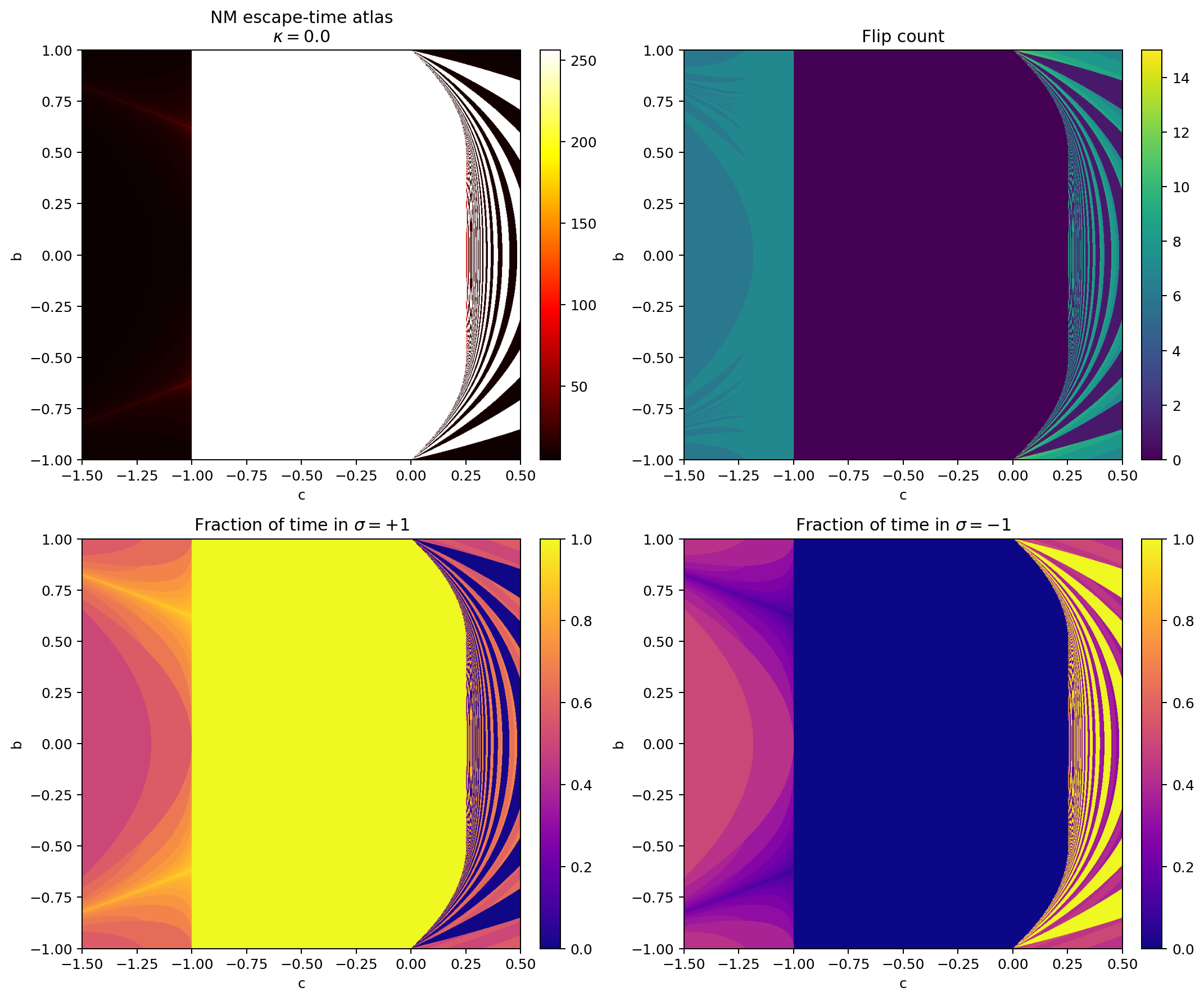 Nested bands appear across escape time, flip count, parity, and occupancy. Persistence across multiple fields suggests structural partitioning rather than a colouring artefact.