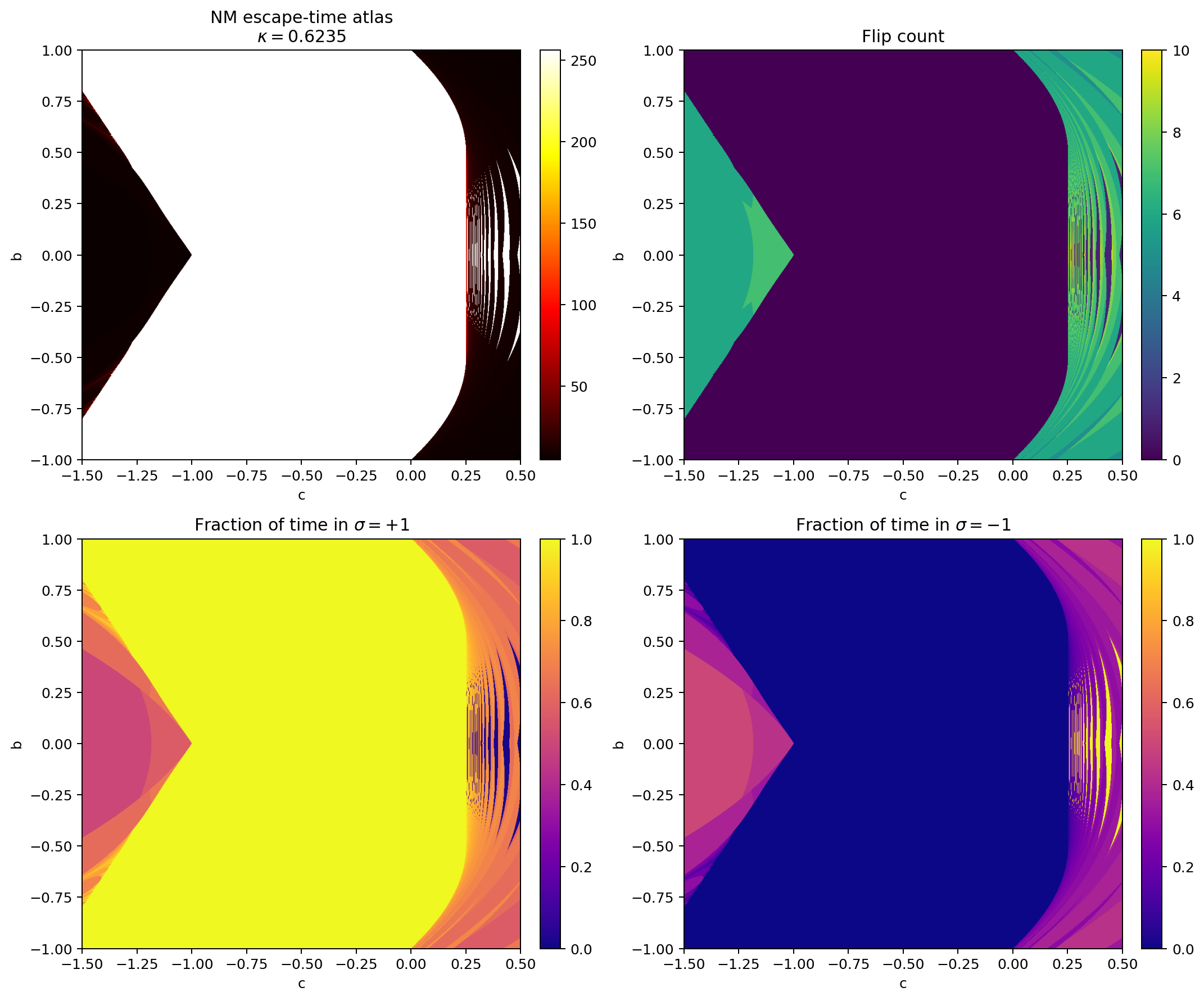 Figure 4: Flip diagnostics at . The wedge, right-hand switching domains, and delayed first-flip contours become sharply expressed.
