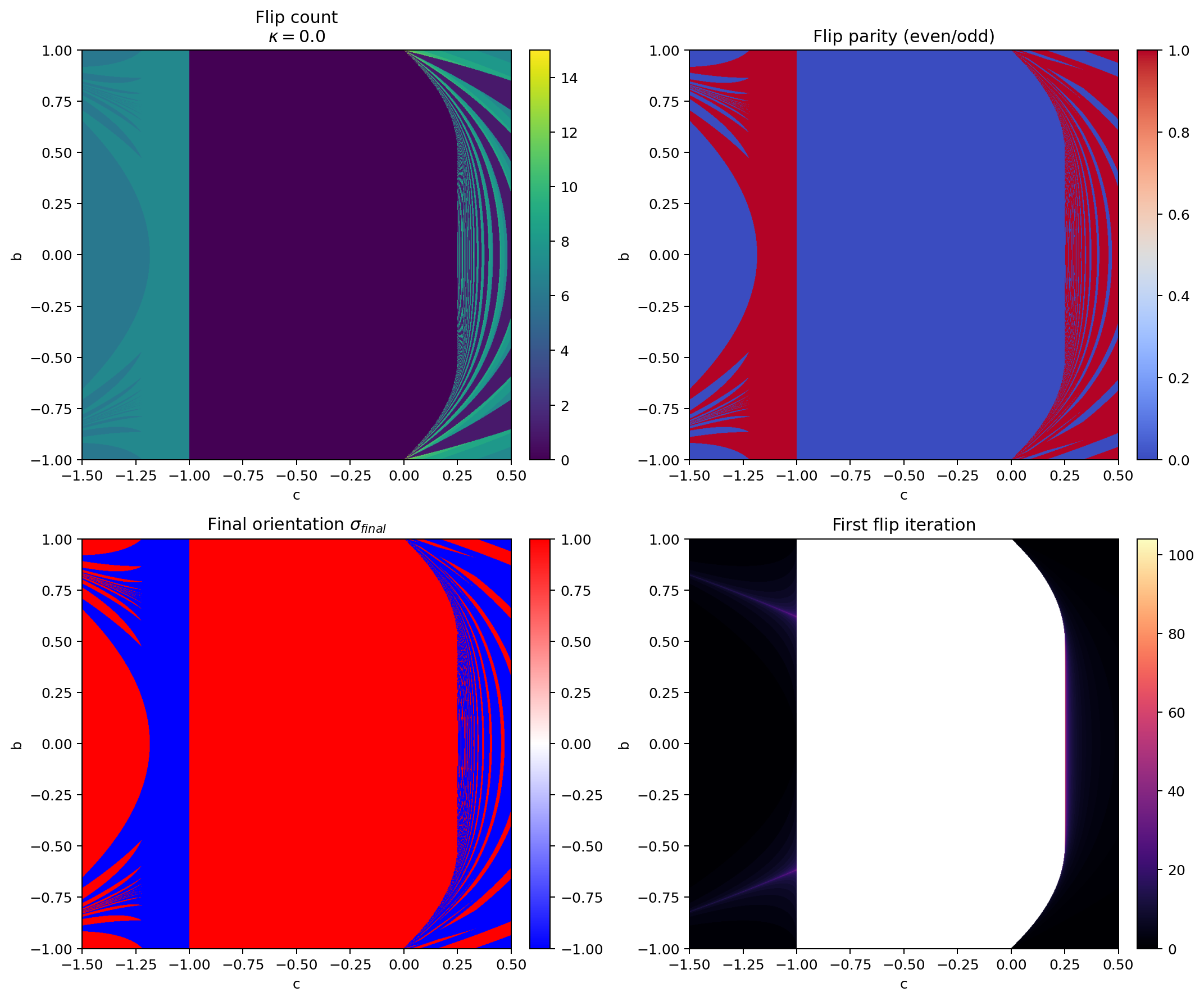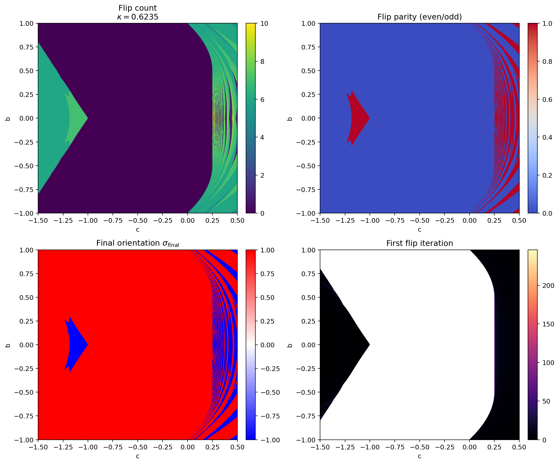 Figure 3: Flip diagnostics at : flip count, parity, final orientation, and first flip iteration.