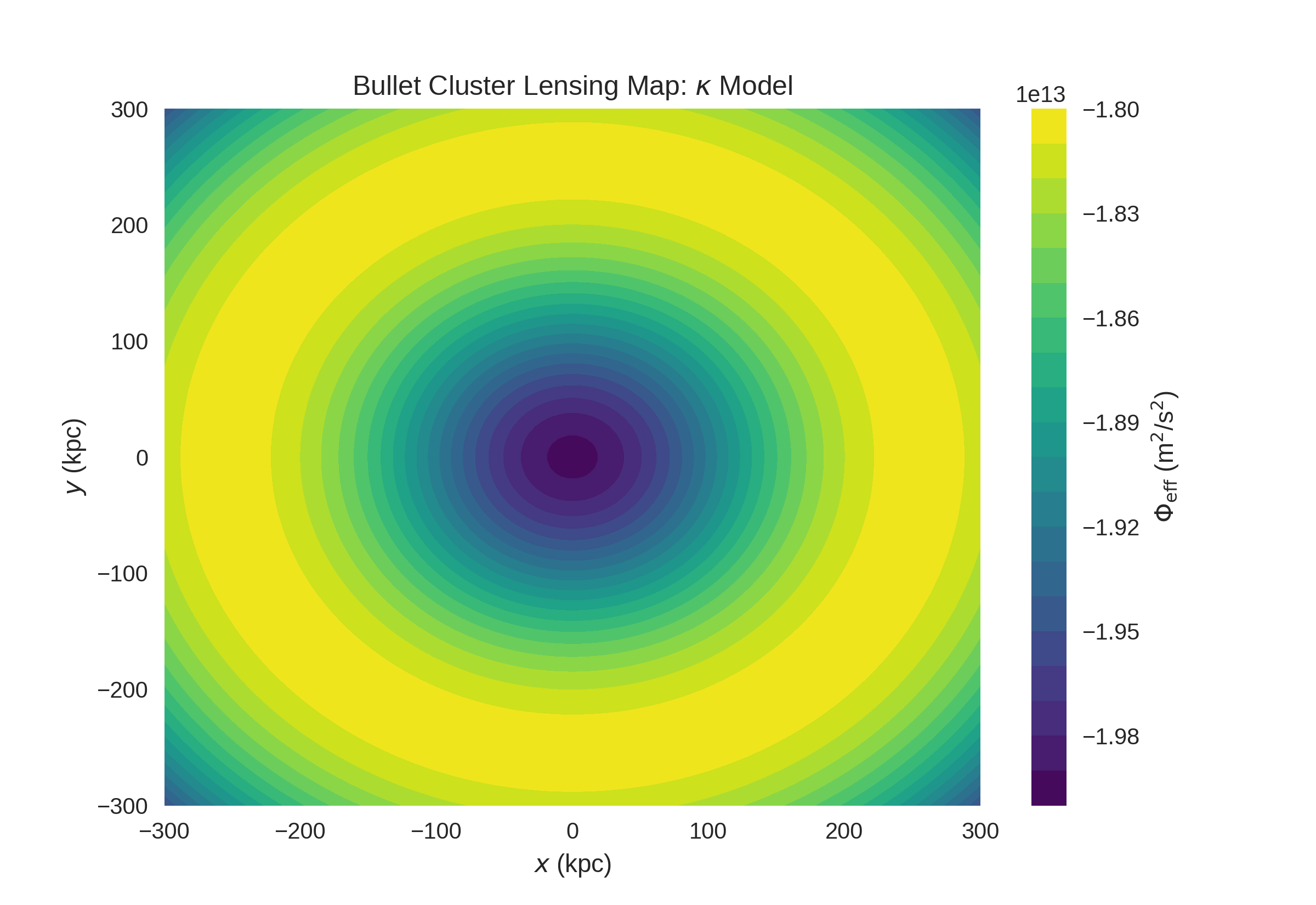 Thus the collision temporarily increases the bending angle by 0.5-1.5%, shifting the centre of the lensing map in the same direction as the observed Bullet-Cluster-type offsets. When the shock dissipates, and , restoring the original potential.