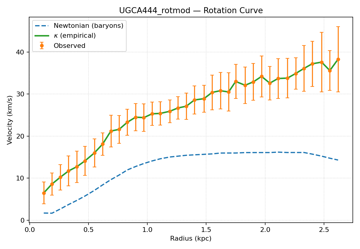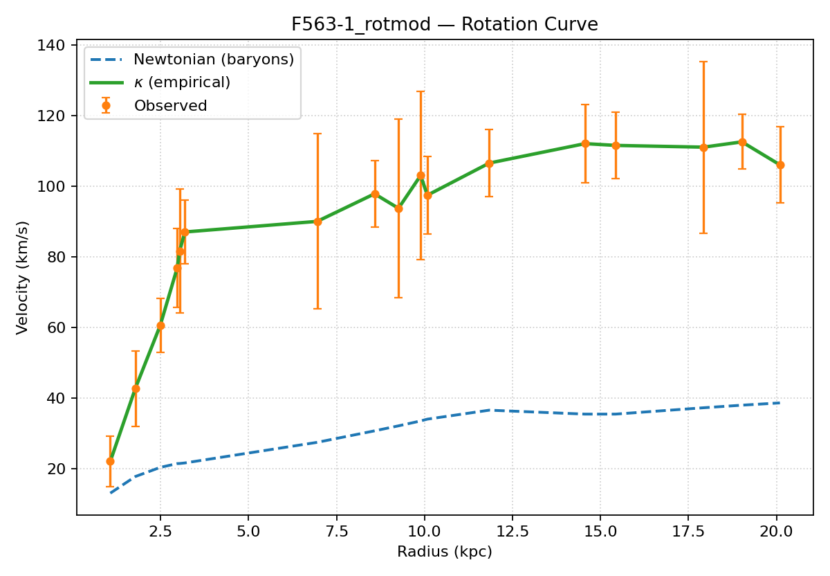The density and velocity gradient are obtained from observationally inferred baryonic mass distributions and measured or modelled rotation profiles. These quantities determine throughout a system. The curvature-modified potential and acceleration follow directly from the expressions above. Once is computed, no additional assumptions or system-specific parameters are introduced.