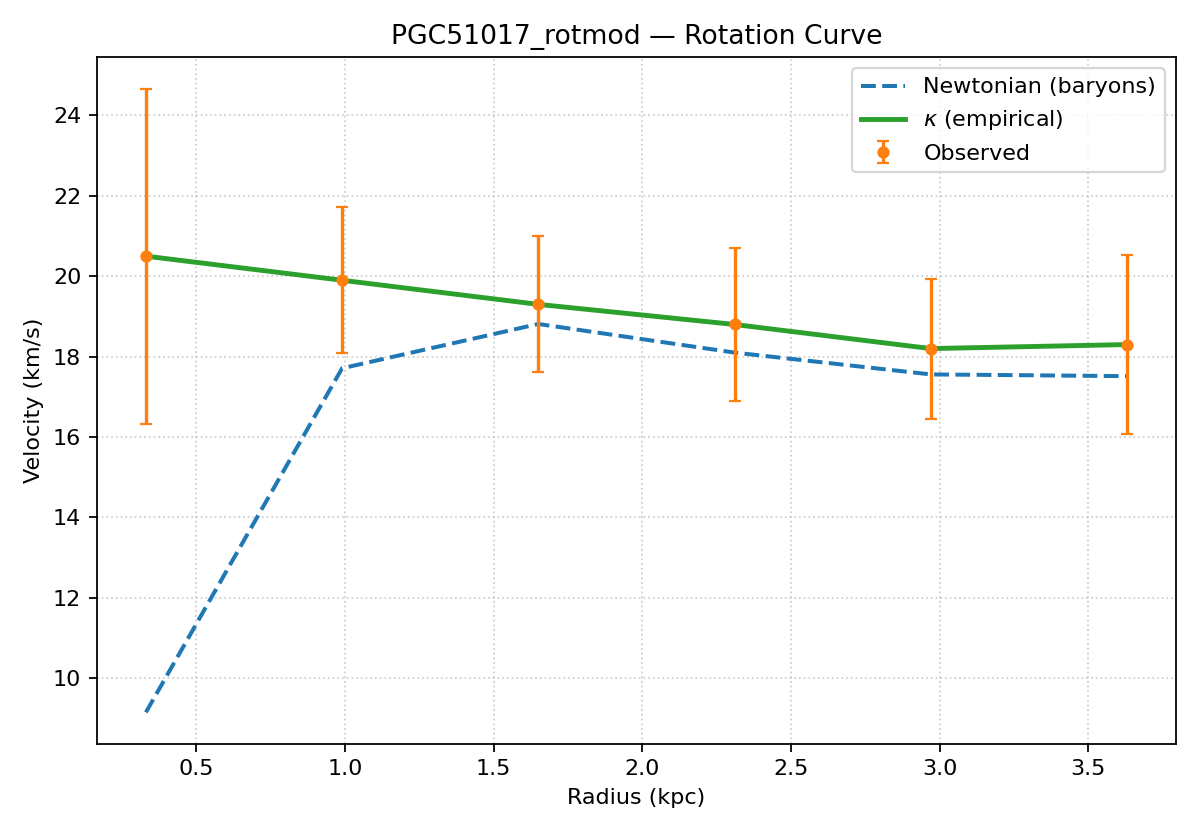 The environment-dependent curvature formulation produces measurable deviations from Newtonian behaviour only in regimes where baryonic density declines and velocity shear becomes non-negligible. A single global parameter set is applied across all systems considered below, allowing direct comparison between planetary and galactic environments.