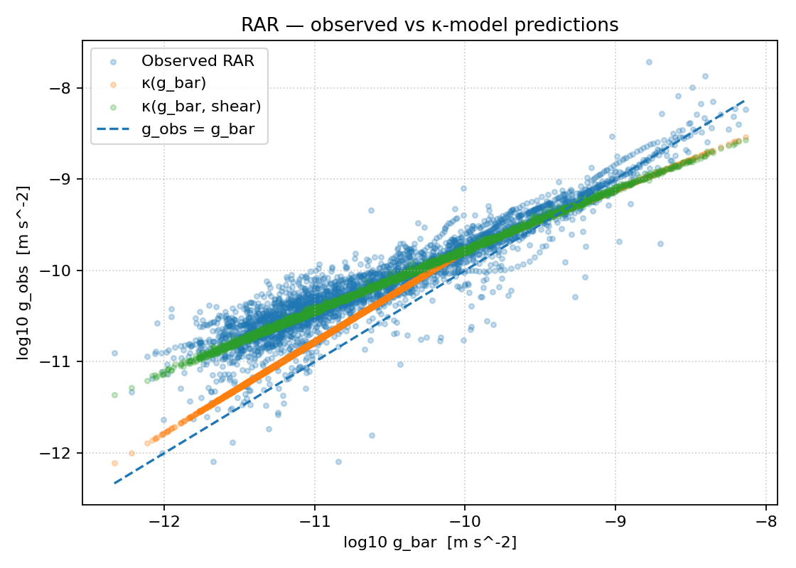 A phenomenological parameterisation of in terms of baryonic density and velocity shear is introduced and evaluated against the SPARC galaxy rotation-curve dataset. The model reproduces the observed sub-linear acceleration relation without requiring additional matter components. The same global parameter set yields consistent behaviour across multiple regimes, including galactic discs, cluster environments, and gravitational collapse.