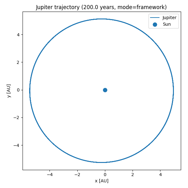 Figures 1 & 2: Newtonian baseline integration of representative planetary orbits using the REBOUND IAS15 integrator. Mercury (inner orbit) and Jupiter (outer orbit) illustrate the range of orbital scales and eccentricities present in the planetary Solar System. The simulations remain dynamically stable over the 200-year integration period.