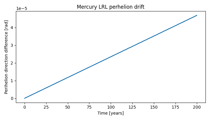 Figure 4: Secular perihelion drift of Mercury: Accumulated difference in the perihelion direction derived from the LRL vector between the Newtonian baseline and the -framework simulation. The ~linear trend indicates a slow secular rotation of the orbital ellipse while the overall orbital structure remains essentially unchanged