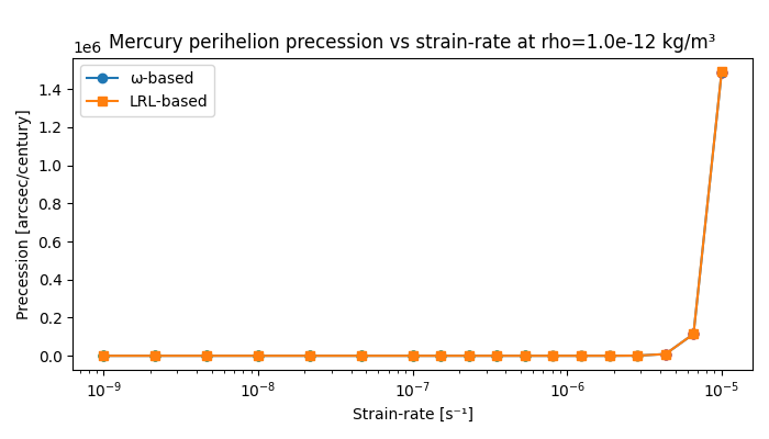 Figure 6: Mercury perihelion precession as a function of environmental strain-rate: Estimated perihelion precession rate for Mercury derived from both the angular momentum (ω-based) method and the Laplace-Runge-Lenz (LRL) vector method as a function of the -framework strain-rate parameter for a fixed density . In the low-strain regime relevant to Solar System conditions, the predicted precession remains extremely small and the two independent diagnostics agree closely. Rapid growth in precession occurs only when the strain-rate approaches values where the orbital solution itself becomes dynamically unstable.