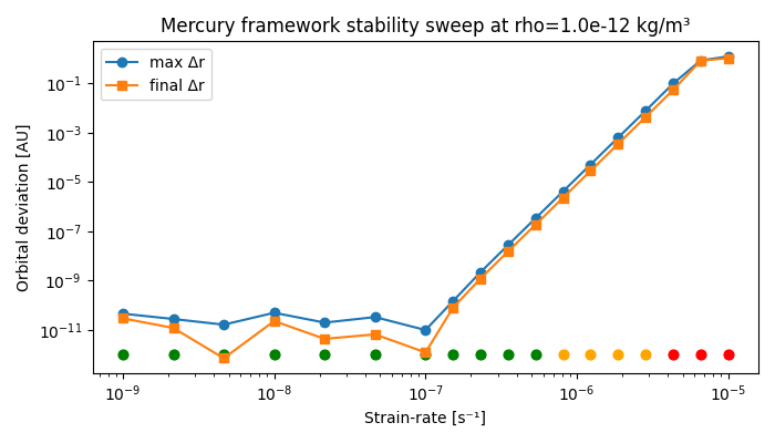 Figure 5: Mercury orbital deviation as a function of environmental strain-rate: Maximum and final orbital deviation relative to the Newtonian baseline for Mercury over a 200-year integration. Three dynamical regimes are visible: a stable regime in which orbital deviations remain negligible, a transitional regime with increasing perturbation, and an unstable regime in which the orbit diverges. The onset of measurable dynamical deviation occurs well after the weak-perturbation regime explored in the present Solar System tests.